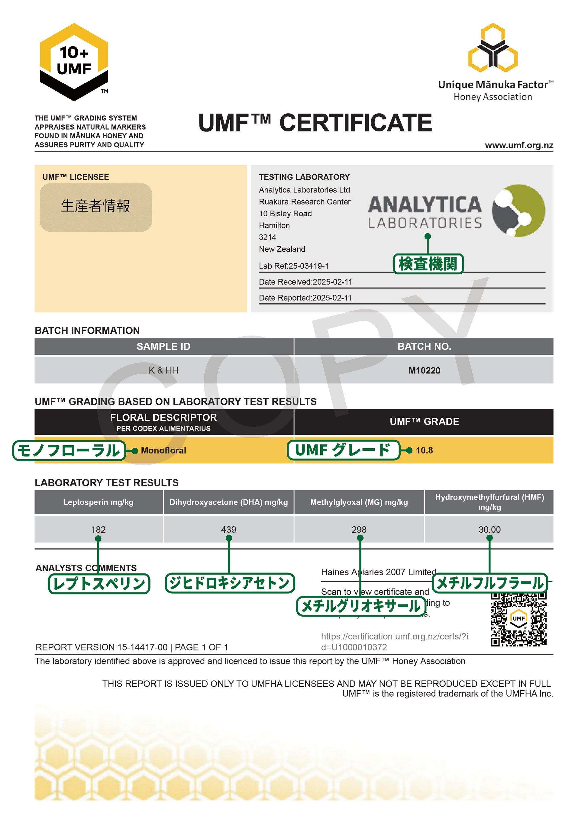 MGO263+、並びにUMF10+の2つの格付けシステム認証もあり、純粋で本物であることが証明されています。