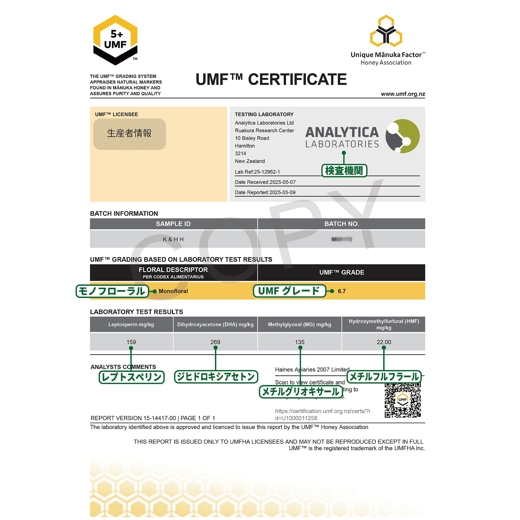 MGO100+、並びにUMF6+の2つの格付けシステム認証もあり、純粋で本物であることが証明されています。