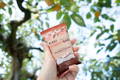 濃厚でビターなカカオの豊かでナッティな風味。カシューナッツ、アーモンドなどのナッツの香ばしさ。カカオニブのカリッとした食感と、深い味わいが楽しめます。柿とデーツのしつこすぎない、程よい甘さは激しいアクティビティの合間にも食べやすい爽やかさ。甘すぎるのが苦手な方、エナジーバーが初めての方に親しみやすいフレーバーです。
